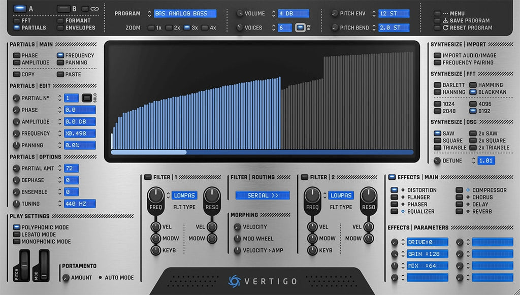 Vertigo is a professional additive synthesizer featuring 512 Euler-generated oscillators with -120dB signal-to-noise ratio.