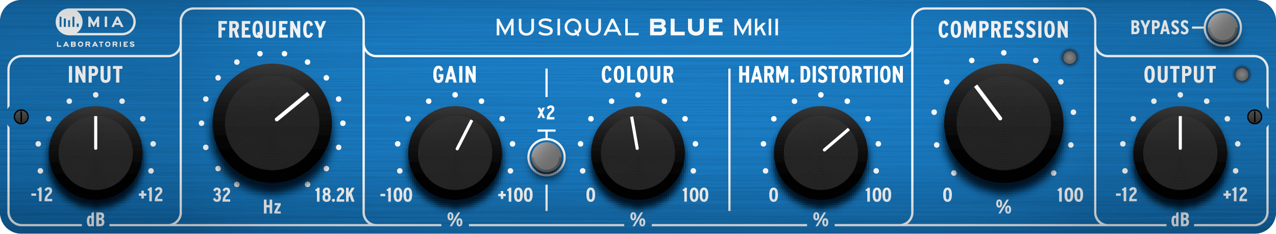The Harmonic Distortion component in Musiqual Blue recreates the asymmetrical clipping, typically found in Class A circuits. It provides the characteristic sound of an overdriven Class A circuit, allowing the user to conveniently control the amount of distortion introduced to the signal.
