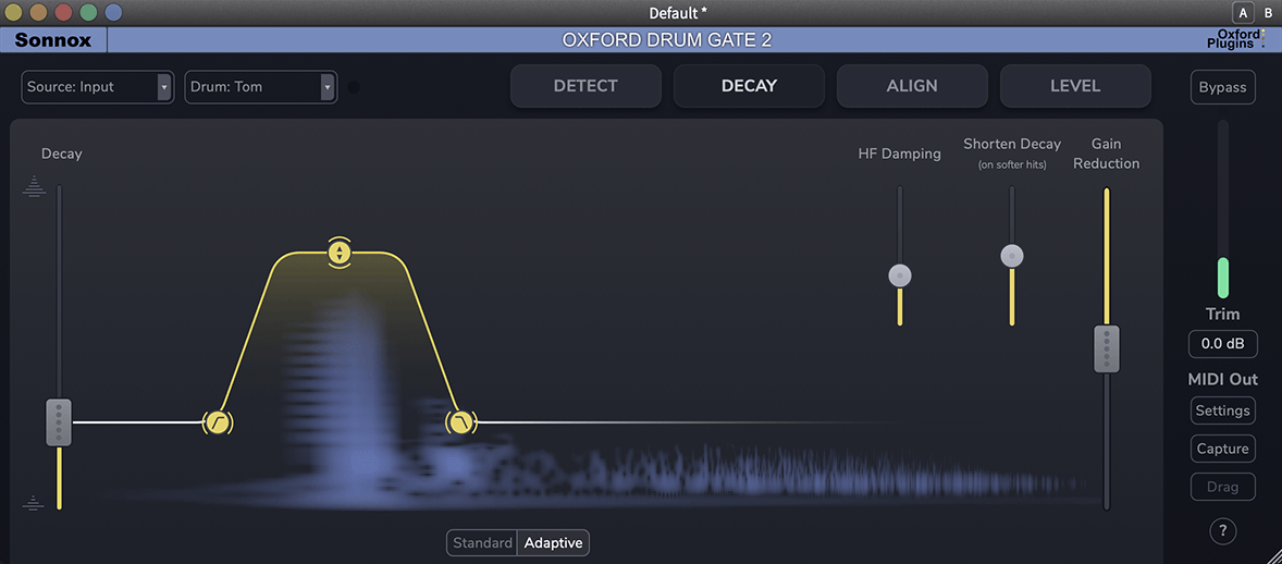 Adaptive Decay adjusts the decay time based on each hit's velocity, so the gate responds musically rather than mechanically.