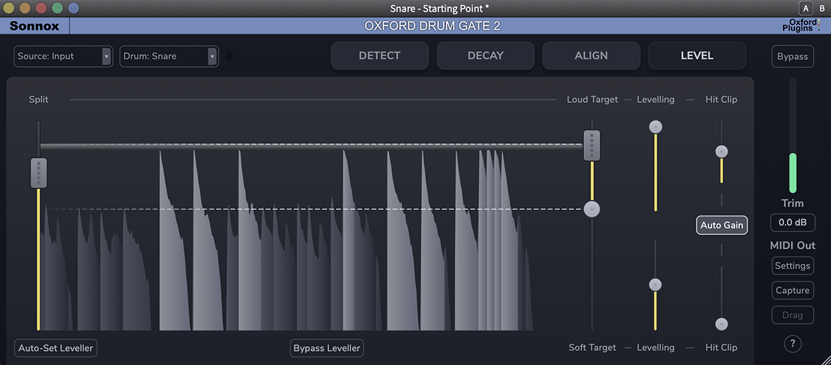 Drum Gate 2's Intelligent Leveller feeds the clipper the peak information, so each transient is clipped on its own terms.