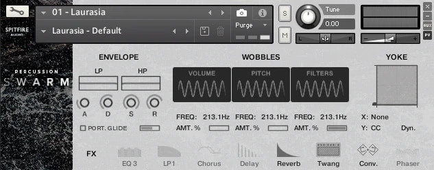 The 'Clouds' are long, looped notes made up of a glorious patina of uneven repeated hits, with a slider to control density, while the Swarms range from thunderous rolls, to swells and bowed metallic sheens, where each individual hit is imperceptible, with a slider to control the speed of the swarm and note length.