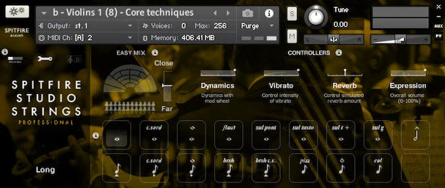 Studio Strings is a medium chamber (or small symphonic) ensemble recorded by section (1st violin, 2nd violins, violas, cellos and double basses), and is available in two versions: Spitfire Studio Strings and the more extensive Spitfire Studio Strings Professional.