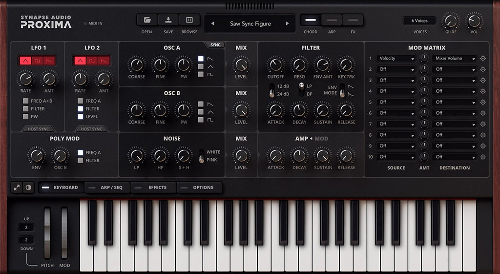 Proxima is based on a unique analog synth from 1982, famous for its rich 6-voice polyphony, signature Curtis analog chips, and the first synth ever to integrate MIDI input and output.