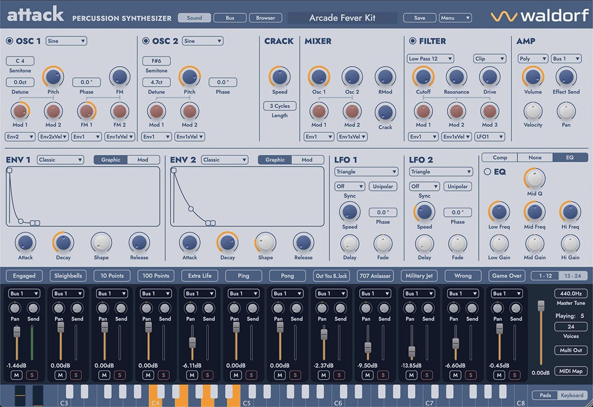 Attack 3 also introduces two fully featured LFOs per sound, with classic waveforms, sample-and-hold, noise, and tempo sync.